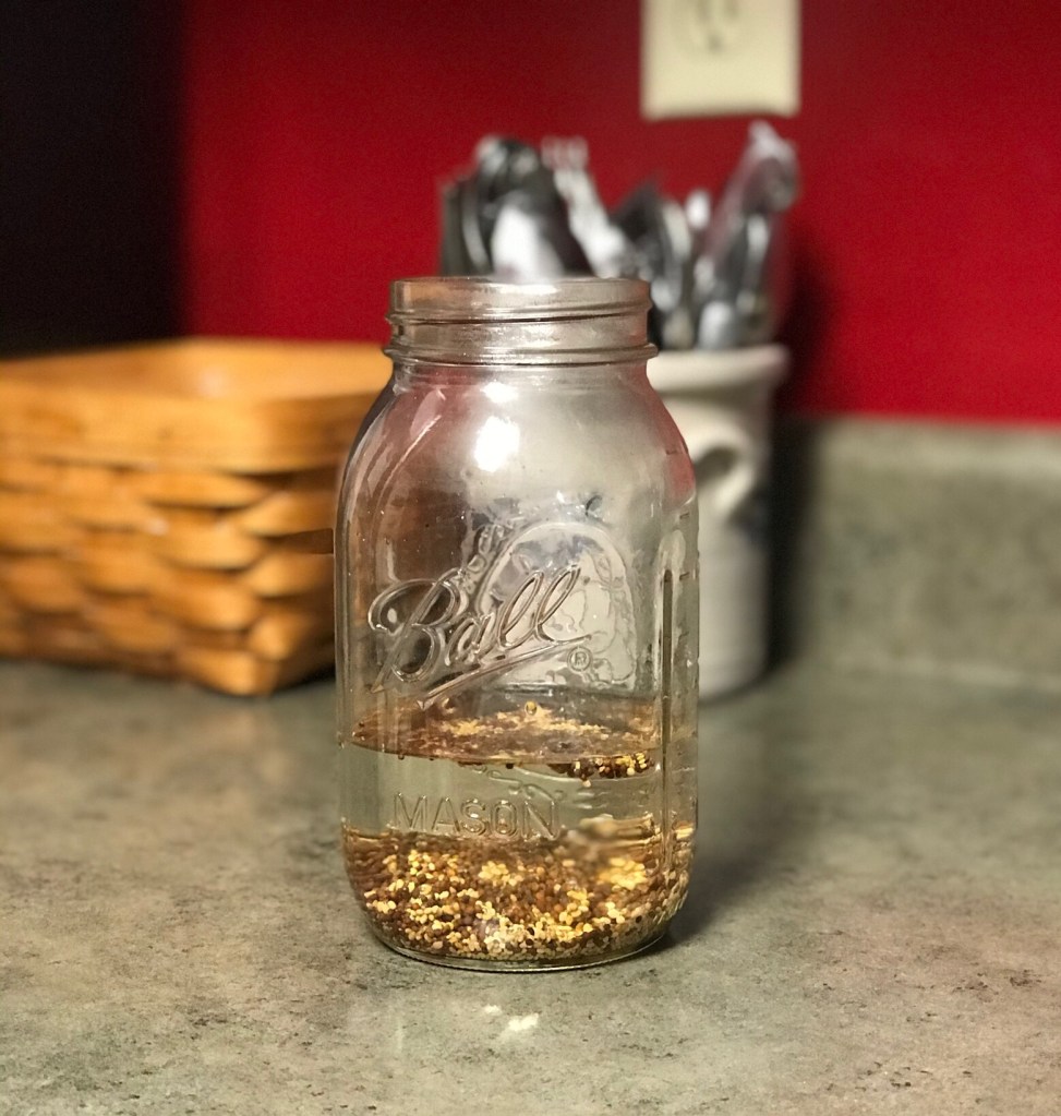 Soak the sprouts for at least 6 hours. I usually soak them for about 24 hours. Cover the jar with a small piece of cheesecloth. I use about 3-4 layers. Use the jar ring to hold it in place. The cheese cloth allows the water to drain and let’s your sprouts breath. You don’t want to cover the jar with a lid.