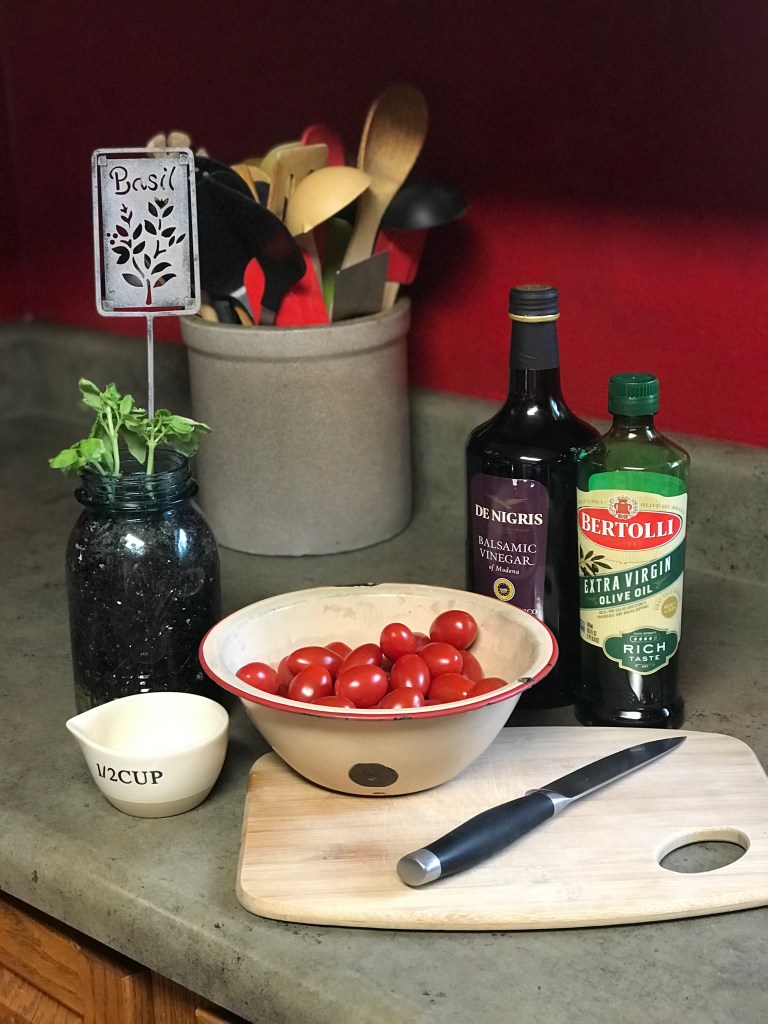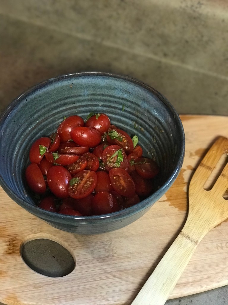First, cut all of your tomatoes in half and put them in a small bowl.