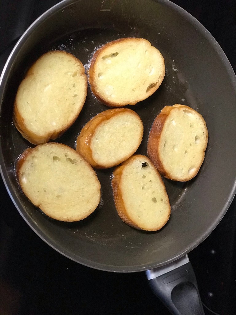 Slice your bread into pieces that are about 1” thick. Butter both sides of the bread and then toast them on medium heat in a large skillet until the just start to turn a little brown.