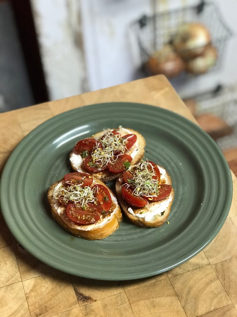 I love to add sprouts to my bruschetta. It makes it healthier, prettier and it tastes great.
